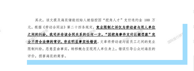 3 、有意思的,海辰储能认为公司和个人因竞业限制违约金赔偿宁德时代没有关系。此前,海辰储能在投诉本号时表示,该文提及海辰储能创始人被指控因“挖角人才”支付违约金 100 万元。根据《劳动合同法》第二十四条规定,竟业限制之诉仅为劳动者与用人单位之间的纠纷,我司并非该合同关系的任何一方。“因挖角事件支付巨额罚款”完全不符合法律的常识,存在明显事实性错误。文章将劳动者与前员工之间的竞业限制纠纷,恶意歪曲事实,转移概念至现用人单位身上,错误引导公众对海辰的评价,损害海辰的商誉。