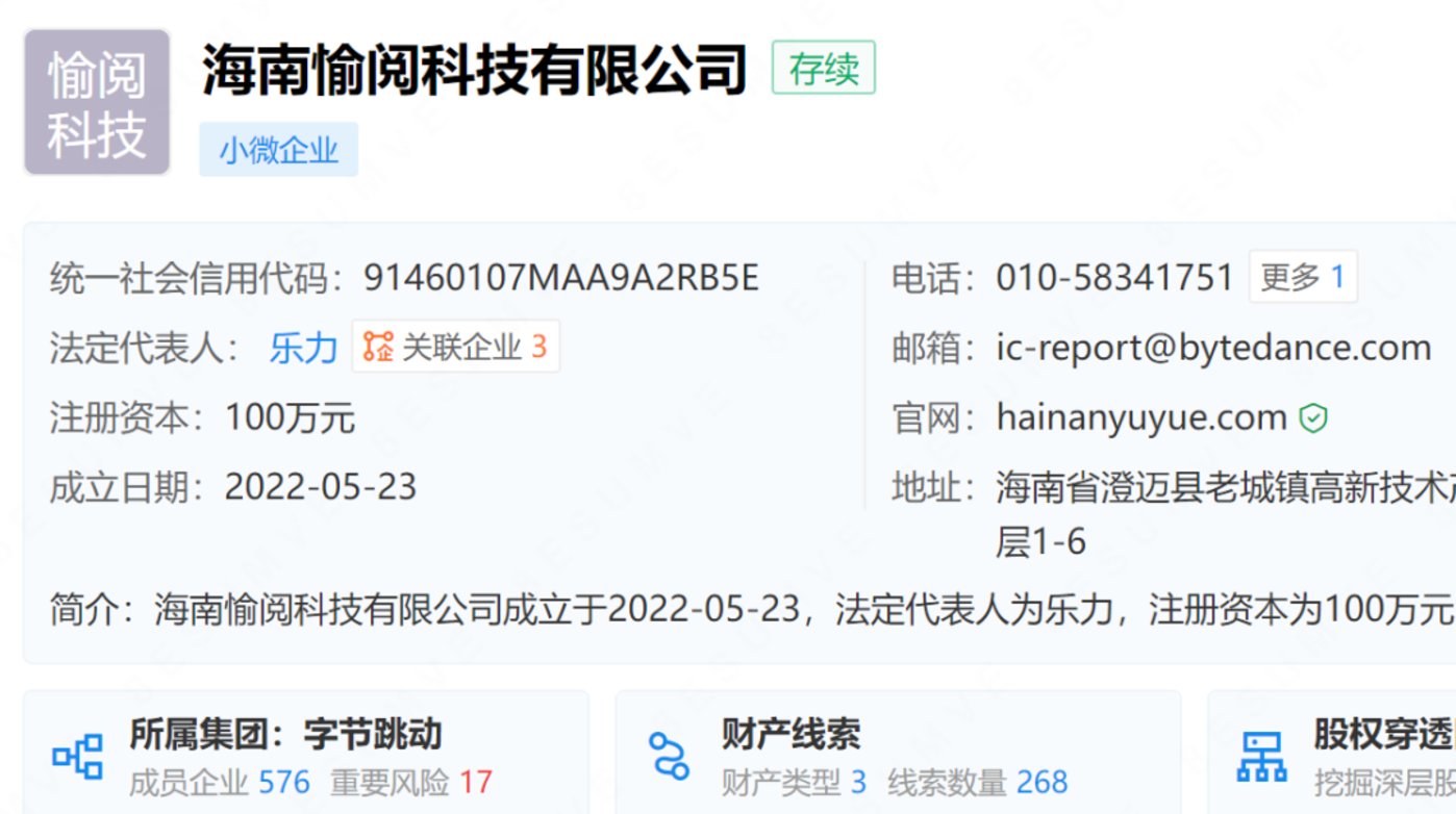 据企查查数据显示,该APP开发商为海南愉悦科技公司,该公司的控股企业是北京抖音的全资子公司,法定代表人为红果免费短剧的总编辑乐力。