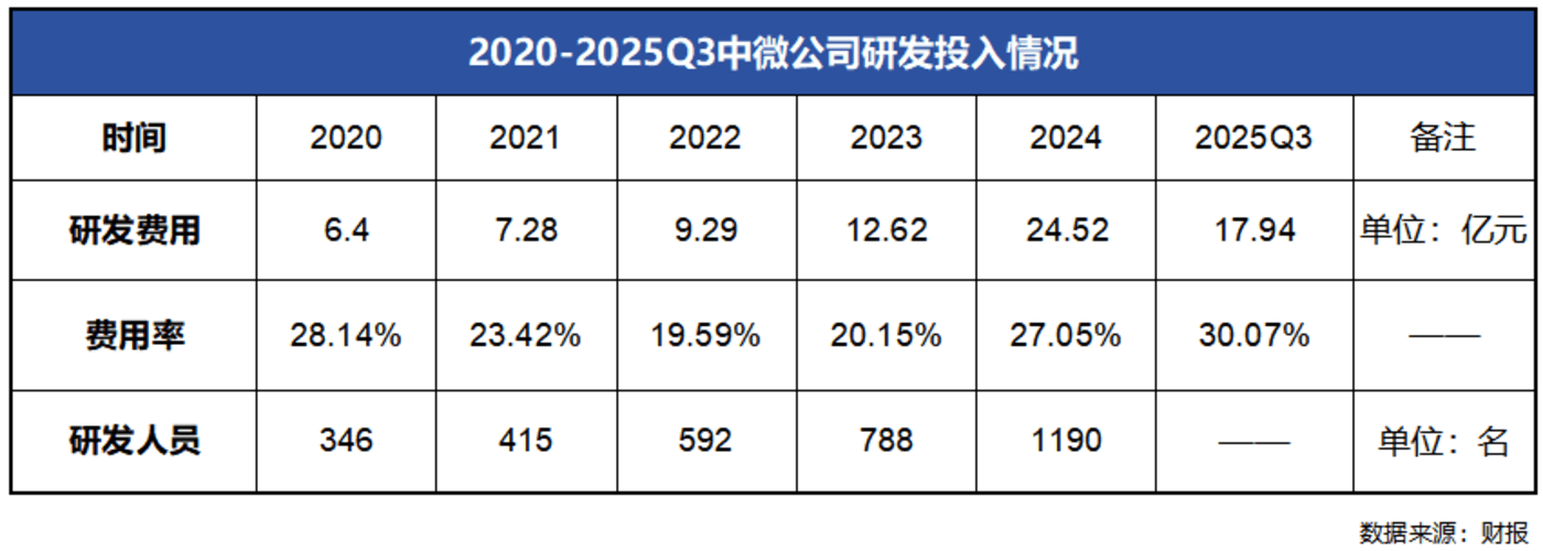 为巩固技术优势,加大研发投入成为普遍选择,中微公司更为决绝,自2020年以来,研发费用已经从6.4亿元涨至2024年的24.52亿元,CAGR(Compound Annual Growth Rate,年复合增长率)达到39.91%。值得一提的是,截至2025年三季度,其1190名研发人员数量以及30.07%研发费用率,均达到近期最高点。