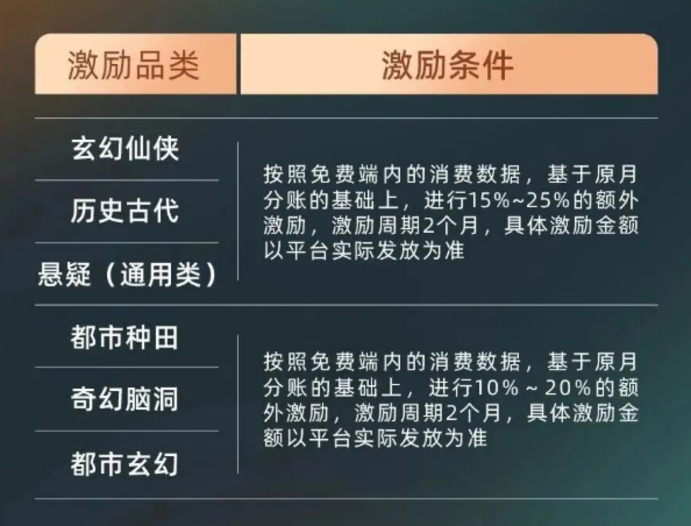 客观来说,“补贴男频”的策略是必要的,红果也拿出了实际行动,比如平台推出的8-10月重点品类激励活动中,针对历史古代、玄幻仙侠、都市玄幻等男频题材进行专项激励,在原月分账的基础上给予额外激励,鼓励创作者多拍男频剧。