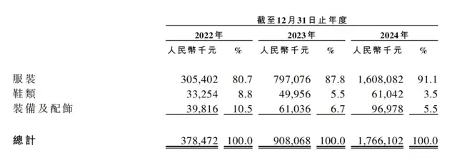 尽管伯希和在招股书未详尽列出品牌所有品类收入细节,只将产品按「服装」「鞋类」「装备及配饰」三大类进行统计,其中「服装」是伯希和首屈一指的大类——2022—2024年报告期内,公司服装类产品收入由3.05亿元攀升至16.08亿元,占总收入的比重也从80.7%一路升高至91.1%。