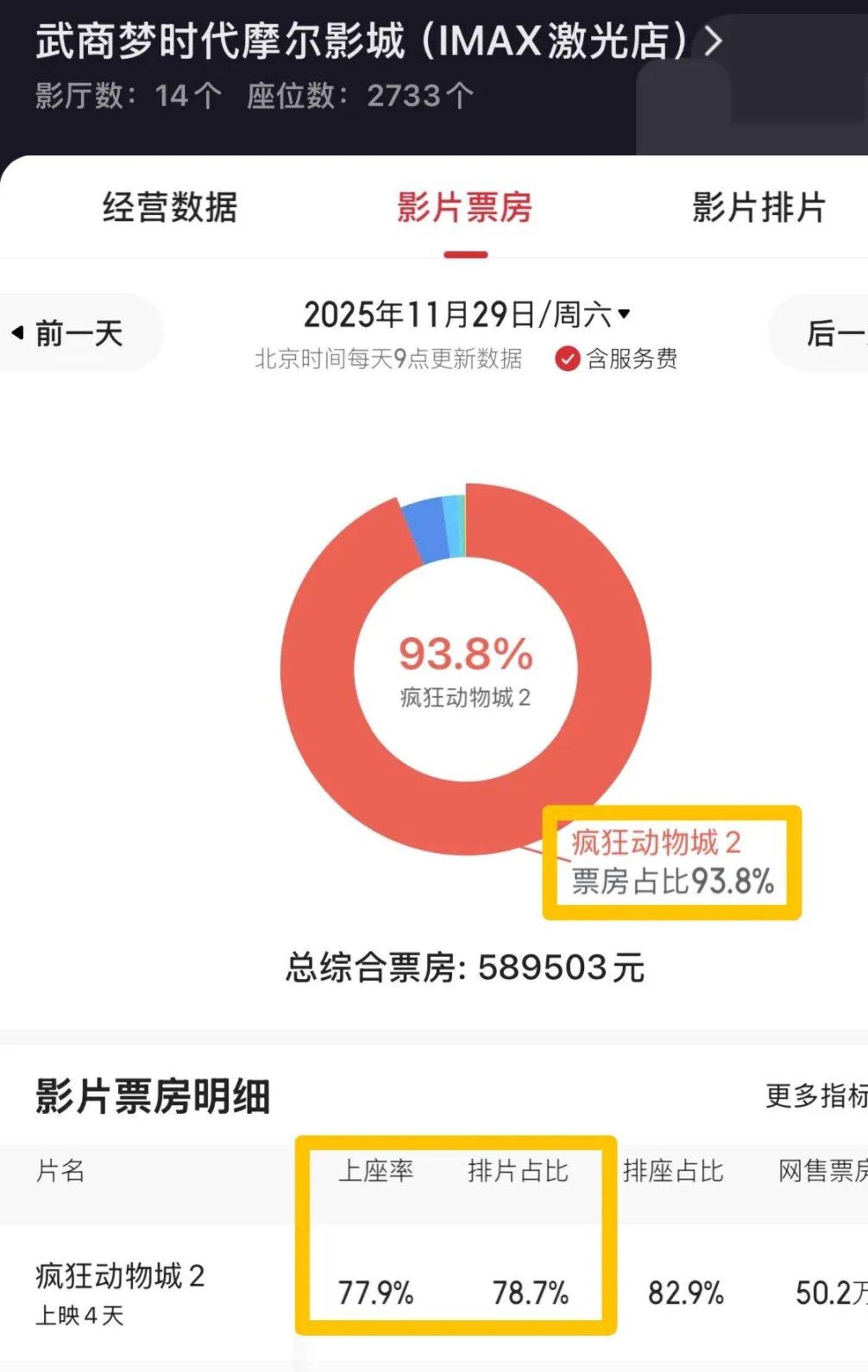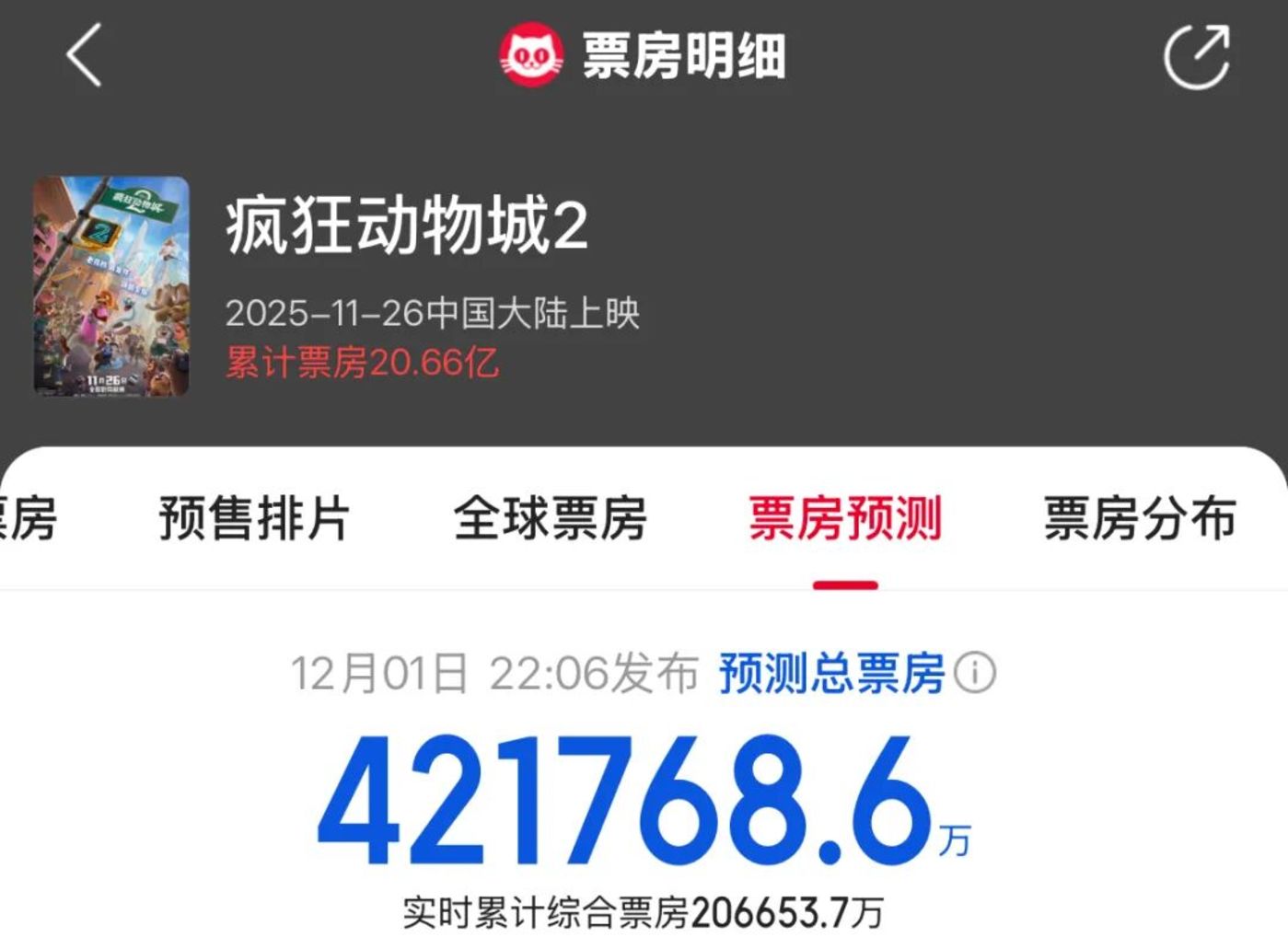 文 | 极客电影,作者 | 子路、羊羊,编辑 | 羊羊、耶耶 《疯狂动物城2》卖疯了! 该片上周三在中国上映,截止目前,上映不到7天,累计票房已经接近21亿。 目前灯塔的预测票房是38.29亿,猫眼专业版则已将该片的预测总票房调整至42.18亿。 《疯狂动物城2》的大卖,形成了一个难得的多方共赢的局面——观众有了选择,影院“起死回生”,中国电影市场回暖,好莱坞大片厂又看到了希望…… 极客电影通过收集影院经理、电影观众、大数据和外媒观点,形成一份颇为有趣的分析报告。 《疯狂动物城2》不仅是一部娱乐性十足的好电影,它也因自身强大的票房号召力成为了一个文化现象,成功地让许多爱电影、在电影行业里工作的人兴奋起来。 2025年的最后一个月,电影终于又“支棱”起来了! △ 截至11月25日,《疯狂动物城2》成为中国影史动画电影预售票房冠军 6天票房突破20亿,《疯狂动物城2》的“疯狂”上映,已经让沉寂许久的影院经理们忙“疯”了,猝不及防,当然也是喜出望外。 △ 《疯狂动物城2》零点场几乎满座情况登上热搜 11月26日首映当天只是一个普通的周三工作日,武汉武商摩尔影投市场负责人黄先生已经提前为这部迪士尼大片增加了工作人员,但还是被当天的人潮震撼到。 △ 深圳CGV影城(卓悦中心IMAX激光店)观众排队盛况 经历首周末电影院的人潮涌动,上海前滩太古里MOViE MOViE影城负责节目与宣传的秦经理更是有一种“梦回春节档”的忙碌感。 更大的调整是排片,今年的电影市场状况,已经击碎了一个又一个“大片神话、IP神话”。一部电影口碑、首日票房开画之前,谁也无法保证是扑是爆。 盛况甚至打败了疫情前,黄先生回忆,以前的大片比如《复联》《变形金刚》《速度与激情》,排片最多也就给到60%。 △ 武商梦时代摩尔影城上周六《疯狂动物城2》排片78.7%,上座率77.9%,单日单片票房55万+ 其他城市的影院排片更加“疯狂”,根据猫眼专业版数据,同样是上周六,北京长楹天街卢米埃影城给《疯狂动物城2》排片82.6%,上海前滩太古里MOViE MOViE影城排片达到85.7%。 卢米埃影城北京城市经理沈颖博表示: 高排片显然已经带来了高票房回报,以武汉武商梦时代摩尔影城为例,上周六单日票房达到58.9万元,已经接近十一、春节档的单日票房水准,相当于影院提前过年了。 △ 《疯狂动物城2》尼克(左)、盖瑞(中)、朱迪(右)剧照 就在《疯狂动物城2》上映前一天,武汉百丽宫影城(壹方店)宣布闭店停业。 武商摩尔的黄先生表示,很多电影院都是疫情前开的,租金非常高,现在票房持续下降,大量影院连房租都付不起,还不包括日常运营的水电费、人力成本,只能关门。 爆款效应不仅仅表现在票房上,影院同步上线了和《疯狂动物城2》配套的爆米花桶、可乐杯,以及IP联名的马克杯、钥匙扣、玩偶等系列周边,卖得特别好。 北京卢米埃沈颖博经理分享,卖品业绩SPP提升了30%。黄先生表示周边卖品销售额一般能占到当日票房的10%,这次工作日单天都卖了3万多元。 △ 影院售卖的《疯狂动物城2》周边商品 深圳卓悦CGV影城经理谢少玲表示,影院特别准备了CGV CINEART海报场活动,该场观影顾客每人均可得到一张CGV独家工艺海报,观众反馈特别热烈。 “回血”还体现在电影贴片广告上,某资深电影广告从业者分享,公司为《疯狂动物城2》招商到了汽车、科技类产品、消费品,算是整个周期招商情况比较好的片子。 △ 与《疯狂动物城2》联名的品牌 复盘全年电影市场,他会更期待更多能够引发强烈社会共鸣的优质片子上映,甚至包括互联网上的优质视频内容能出现在影院,而不仅仅是传统的电影。 影院经理则普遍认为,短期内“合家欢喜剧片”仍会是保证票房的关键类型,也期待在科幻、惊悚等常规类型之外能多涌现创新内容,避免观众的审美疲劳。 截至上周五,大家对《疯狂动物城2》的票房表现还算保守,基本保持在30-35亿。经过首周末的疯狂表现,影院经理的票房预测普遍调整到40亿以上,最高的一位预估达到44亿。 或许我们可以再大胆一点,在冷档期都能掀起“疯狂”热潮的《疯狂动物城2》,票房能达到50亿以上吗? 信心同样来自口碑。 上映一周,《疯狂动物城2》口碑基本保持在优秀线之上。豆瓣33万+人评分8.5,五星比例42.1%,IMDb7.8,烂番茄新鲜度94%。 虽然比不上前作一骑绝尘的豆瓣225万+人评分9.3,但已经是近期院线电影最高水准。 △ 截至目前,《疯狂动物城2》豆瓣评分8.5 喜欢的观众已经开始在朋友圈等社交平台批量玩梗,与“狐兔CP”AI合影,希望穿越进动物城世界里感受爱与和平。 作为一部全年龄向合家欢喜剧动画片,几乎每一个观众都能在电影中找到独属于自己的萌点。当下已经分出了几种派别: 磕CP党:被“你是我的兔子窝”刷屏,坚信狐兔之间必是爱情,电影票就当随礼了。 △ 部分观众坚信狐兔之间必是爱情 被细糠喂养之后猛抠细节彩蛋党:第二部延续迪士尼制作水准,将动物城拓展至爬行动物世界,画面精细程度十分视觉友好。 电影中特意安排了众多迷影彩蛋,除了夏奇羊、豹警官、闪电等可爱角色的返场之外,还致敬《料理鼠王》《沉默的羔羊》《闪灵》等经典电影。 △ 电影中安排了众多迷影彩蛋,致敬经典电影 女性主义党:影片中刻画的最强战力女警猪贝贝是个非刻板印象下的女性角色,动物城幕后统治者猞狸家族实际上抢走了蛇奶奶的气候墙设计,是一