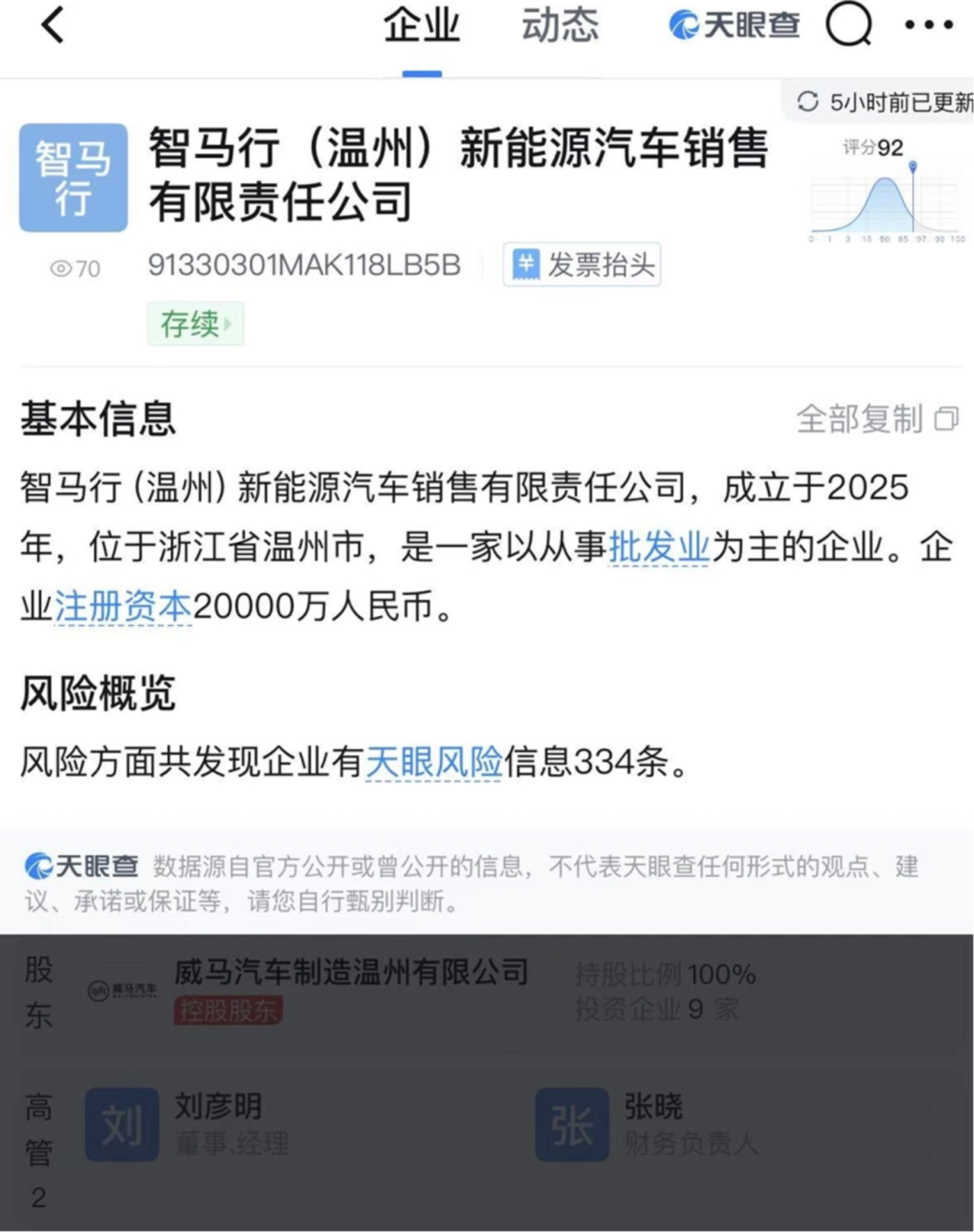 图/智马行(温州)新能源汽车销售有限责任公司成立 来源/互联网 新能源观截图