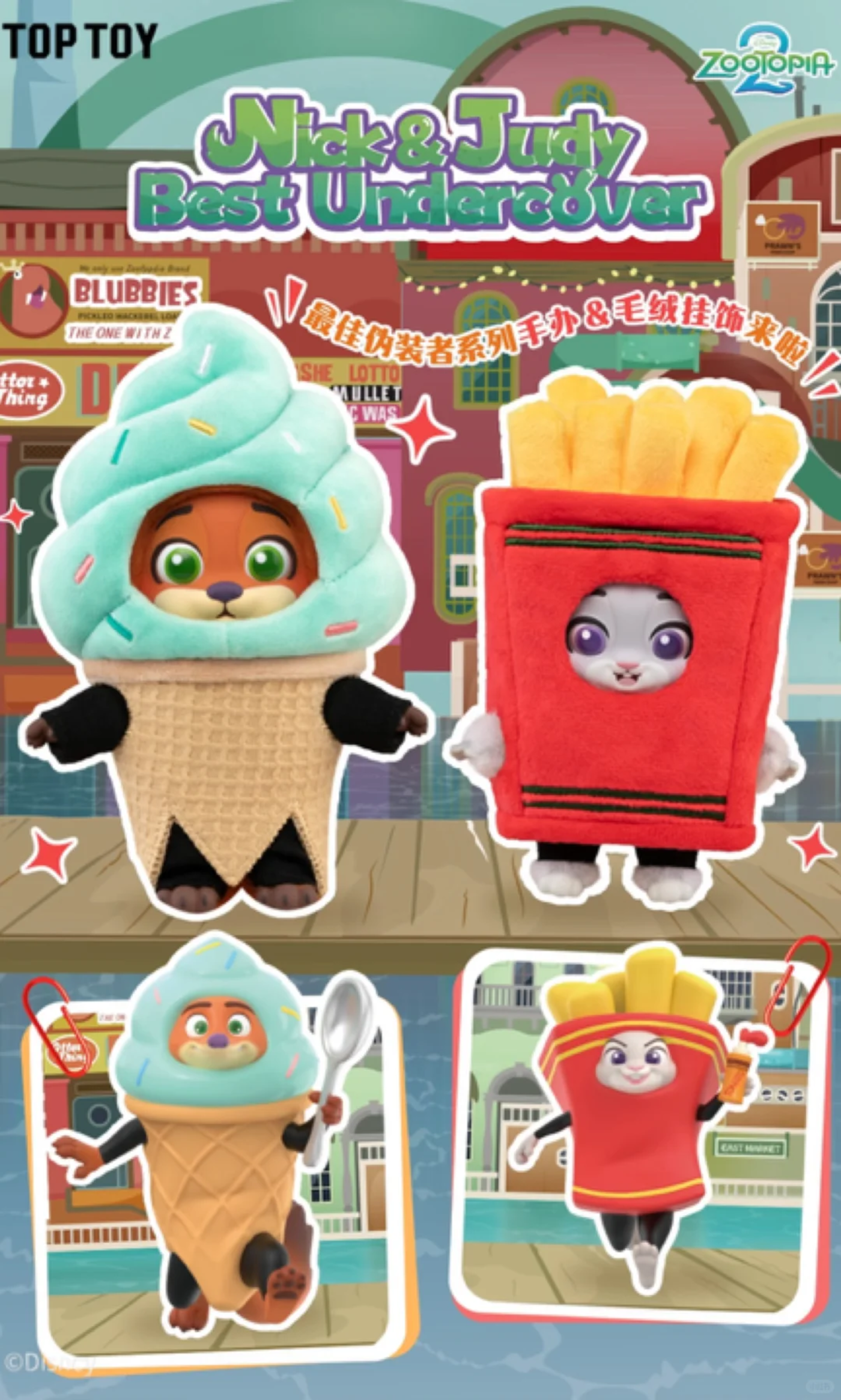 TOP TOY作为其中的代表性玩家,基于对电影剧情的深度理解,构建了还原向以及二次创作的产品矩阵:一方面,品牌推出了迪士尼《疯狂动物城2》新旅程角色系列盲盒;另一方面,基于剧情中的创意点进行二次开发,如以朱迪、尼克查案乔装情节为灵感,打造迪士尼《疯狂动物城2》最佳伪装者系列手办盲盒,采用布料与PVC混合材质,提升产品手感与收藏价值。