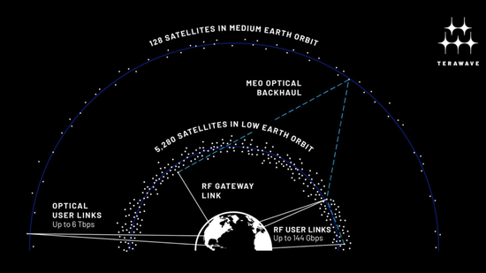 相比之下,TeraWave未来计划部署的5408颗卫星中,包括5280颗低地球轨道卫星和128颗中地球轨道卫星,采用双轨道设计,通过激光光学链路提供6 Tbps的极速连接,Q/V波段也能提供144 Gbps的传输速度。