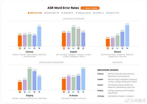 作为全链路语音模型系列的听觉基座,MiMo-V2.5-ASR在中英双语、中文方言、Code-Switch、强噪音、多说话人、高知识密度等复杂真实场景下均达到业界领先水平。