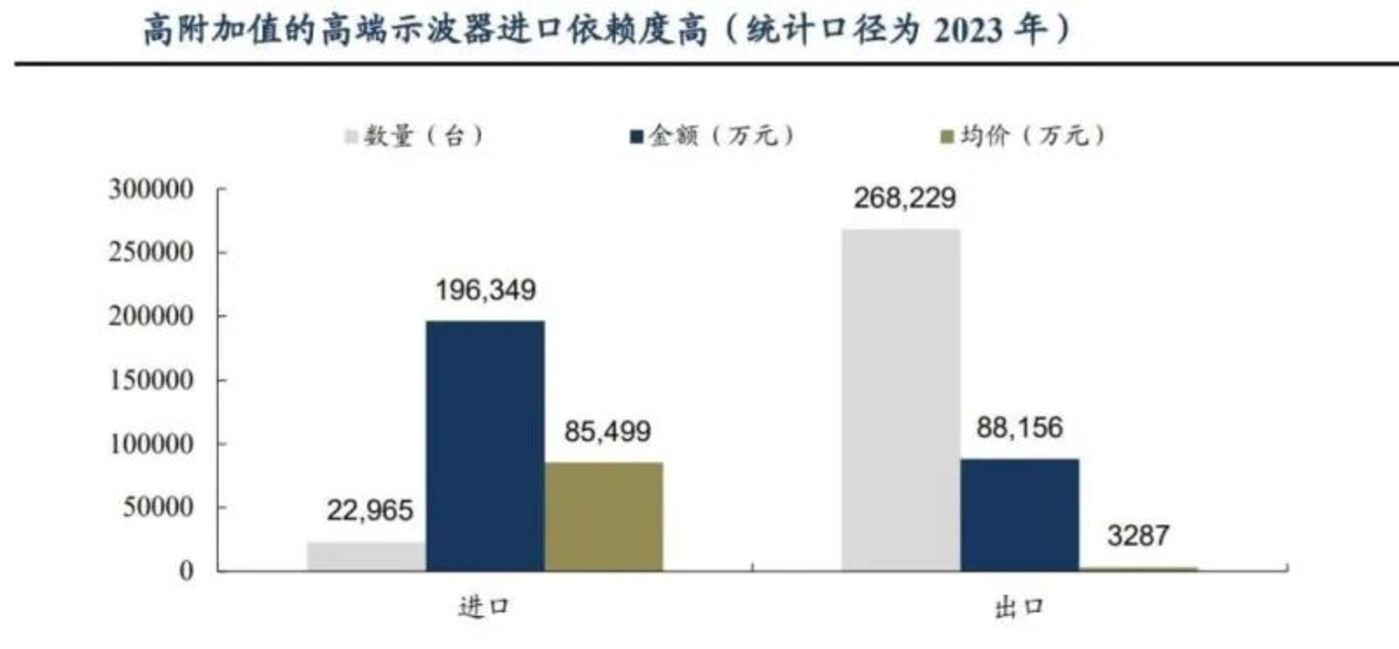 进出口数据也印证了这一结构性差距。根据中国海关数据,2023年我国共进口示波器22,965台,均价高达85,499元人民币(约12,243美元),主要为中高端产品;同期出口26.8万台,平均单价仅3,287元人民币(约458美元),以中低端产品为主,全年示波器贸易逆差高达1.56亿美元。这意味着,中国在高端示波器领域的自给能力依然极为有限,核心技术和市场利润仍集中在国外企业手中。