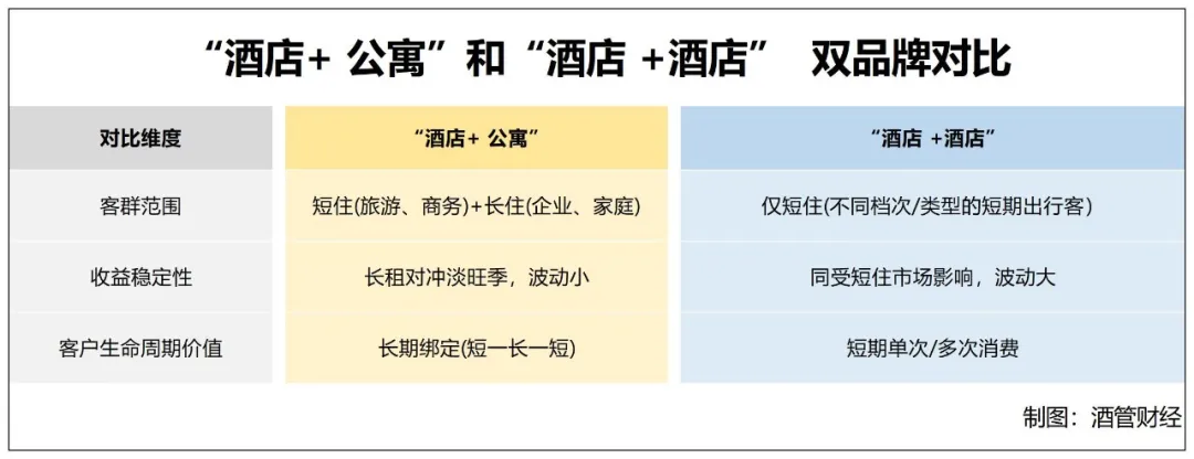 雅阁酒店 据了解,该项目是“雅阁酒店+澳斯特公寓”双品牌,约有126间酒店客房及54套服务式公寓。 其中,雅阁酒店定位高端商务,配套会议、宴会、餐饮及娱乐设施;澳斯特公寓主打简约长住,面向企业高管与旅居家庭。 雅阁酒店集团表示,双品牌可共享客流与配套,提升资产收益,该模式已在浙江温岭、清远等地复制。 其实,雅阁酒店集团的双品牌模式并非孤例。 万豪在厦门、苏州等地打造“丽思卡尔顿酒店+万豪行政公寓”组合,共享25米恒温泳池、宴会厅等设施; 岭南的“岭南东方酒店+岭居创享公寓”组合,酒店以岭南园林设计与粤式餐饮为特色,公寓则配备共享厨房、岭阅图书馆等社交空间; “深圳瑞吉酒店+瑞湾府行政公馆”组合,华侨城与万豪合作开发的超高层综合体,住户可享受酒店泳池、餐饮等配套,同时拥有独立出入动线,兼顾私密性与高端服务。 那为什么酒店集团会从单兵作战改为抱团合作?为什么双品牌酒店会越开越多? 一方面,酒店正面临供大于求的存量竞争;另一方面还要积极探索新增量。 因此,无论是国际酒店集团还是国内酒店集团,都需迅速找到一片热土去拓展市场。 而商务客群、家庭游客、年轻旅行者的消费需求分化,传统酒店很难覆盖更多人群、满足用户的多元化需求。 图源:智研咨询 与此同时,有数据表示,2024年中国酒店式公寓新增套数将增长至35.5万套,租金规模将增长至2079.8亿元。未来,中国酒店式公寓市场将继续保持高速增长。 显然,“酒店+公寓”的双品牌战略更容易形成协同效应,也可提高相应品牌的曝光度及市场占用率,无疑被酒店行业视作占据市场的利器。 目前,市面上常见的的双品牌组合模式有: “酒店+公寓”的混搭; “高低配”的酒店品牌搭配; 而在具体实践路径中,国际品牌和本土品牌的混搭同样较为常见。 实际上,不论是“酒店+酒店”,还是“酒店+公寓”的组合,其背后原因无非就是迎合消费者多样化住宿需求、降低开发和运营成本。 值得一提的是,随着市场化细分和竞争加剧,未来或有更多超越双酒店品牌之外的产品集群涌现,酒店业真正进到了“大乱炖”时代。 同为双品牌组合,为何“酒店+公寓”的形式在这两年也逐渐多了起来?相比“酒店+酒店”的同业态细分,其又有何优势? 简单来说,“酒店+酒店” 是在同一池子里分蛋糕,而 “酒店+公寓” 是同时挖两个池子的水。 前者可以优化短住市场的收益,后者则能开拓长住市场的新需求。 另外,“酒店+公寓” 通过业态互补解决了 “酒店+酒店”无法突破的3大痛点: 首先,从淡旺季角度来看,“酒店+公寓”组合模式不是把鸡蛋放在一个篮子里,而是在客源上实现互补。 “酒店+酒店”是一个业态内的细分,会同步受淡旺季、政策、突发事件等影响,收益波动较大。 就像旅游城市中“高端酒店+经济型酒店”的组合模式,在旺季时二者都满房,淡季时则会一起闲置。 而“酒店+公寓”的组合模式中,公寓作为长租业态,能提供固定现金流,在一定程度上可以对冲酒店的短期波动。 其次,从客群单一角度来看,“酒店+公寓”组合模式实现了全周期覆盖。 “酒店+酒店”模式的互补,仍局限于1-7天的短期住宿;而“酒店+公寓”则能覆盖、触达更广泛的客群。 比如万豪的“丽思卡尔顿+万怡”,二者都服务商务差旅客,只是消费档次不同,客群范围被锁定在短期出行;而“酒店+公寓”的组合模式,既能承接旅游、商务短租客,又能服务企业外派员工、创业者等长住客,客群覆盖范围是前者的 2-3 倍。 最后,从坪效角度来看,“酒店+公寓”组合模式中,淡季酒店空房时,公寓的长租客已锁定房间(如企业签约整层给员工),空间利用率始终保持 80% 以上。 总之,“酒店+公寓”战略的本质是 1+1>2。既解决了单一酒店淡旺季波动大、客群范围窄的痛点,又能通过客户转化与资产高效利用,提升长期收益。 尽管“酒店+公寓”双品牌战略在市场互补等方面优势明显,但在实际运营中也面临多重挑战,最大的难题是如何避免品牌之间的内部竞争,实现真正的互补? 一方面是管理复杂度增加,在服务标准与人员管理上都存在显著差异。 酒店的服务标准与公寓的服务逻辑存在差异。比如酒店24小时客房服务强调及时响应,而公寓会组织社区活动,则更注重个性化服务; 酒店员工具备高流动性、高强度服务能力,而公寓员工则更需要稳定性、维护客户粘性。 另一方面则是成本控制难度加大,初期投入与后期维护压力并存。 同一物业内实现“酒店+公寓”功能分区,需结构性改造,投入成本高昂;双品牌需平衡高毛利短租与稳收益长租,但实际操作中可能顾此失彼。 例如,某项目因酒店客房隔音差,长租客在社交媒体抱怨“居住体验像快捷酒店”,导致公寓在长租平台评分从 4.8 降至 3.5,续租率下降。 图源:雅阁酒店集团 最为关键的一点则是品牌定位风险,高端与中端组合易引发价值稀释。 若酒店与公寓定位差异过大,如高端酒店+中端公寓,可能导致客群认知混乱。例如,某“高端公寓+中端酒店”项目中,部分商务客因公寓大堂与酒店共享,误认为公寓是酒店的 “附属产品”,愿意支付的租金比公寓低15%-20%。 “要避免同质化内卷。这一点,对于双品牌模式而言,尤其重要。”一位酒店行业分析师指出。 此外,双品牌在实际落地时,还需考虑市场需求波动、政策合规风险、运营效率损耗等多方面因素,若无法