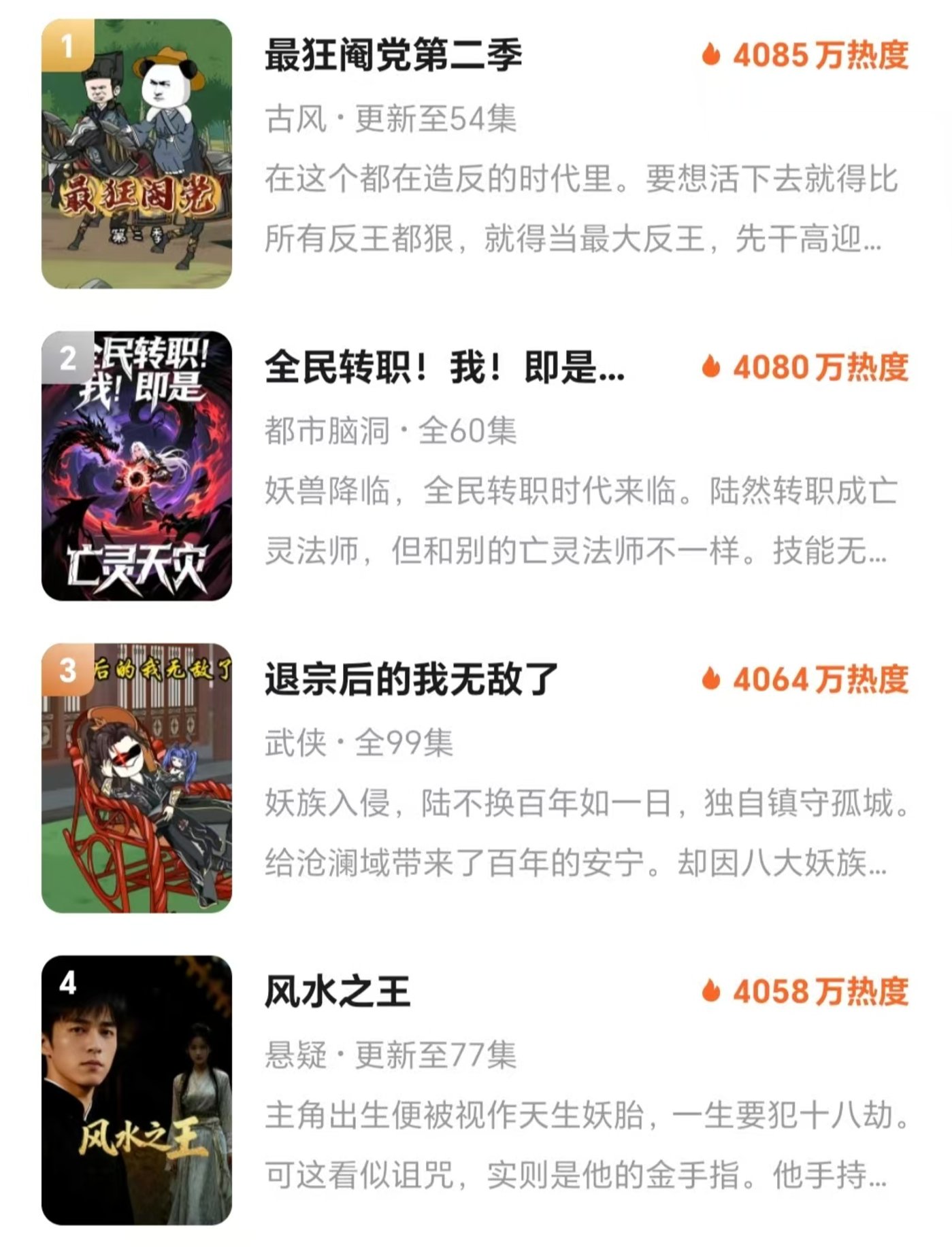 当然,同当初野蛮发展的短剧一样,现在的漫剧市场也处于一个野生、混乱的状态。AI技术、制作公司、内容平台、版权方、广告主等力量同时涌入,生态正在形成,但尚未像短剧那样标准化,也没有什么行业侧目的爆款出现。
