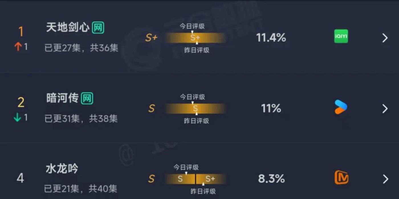 但这也使得,这批大男主剧只有粉丝买账,观众大多无感。三部大男主剧还未收官,但峰值已然可见。BG属性最强、感情线占比最高的《天地剑心》仍然打动了一部分的古偶基本盘观众,云合市占率11.4%排名最为靠前,但也由于女主和感情线存在感过强,男主粉丝也颇有微词,影响热度的进一步发酵。《暗河传》和《水龙吟》则分别只有11%和8.3%,总体表现过于平淡。