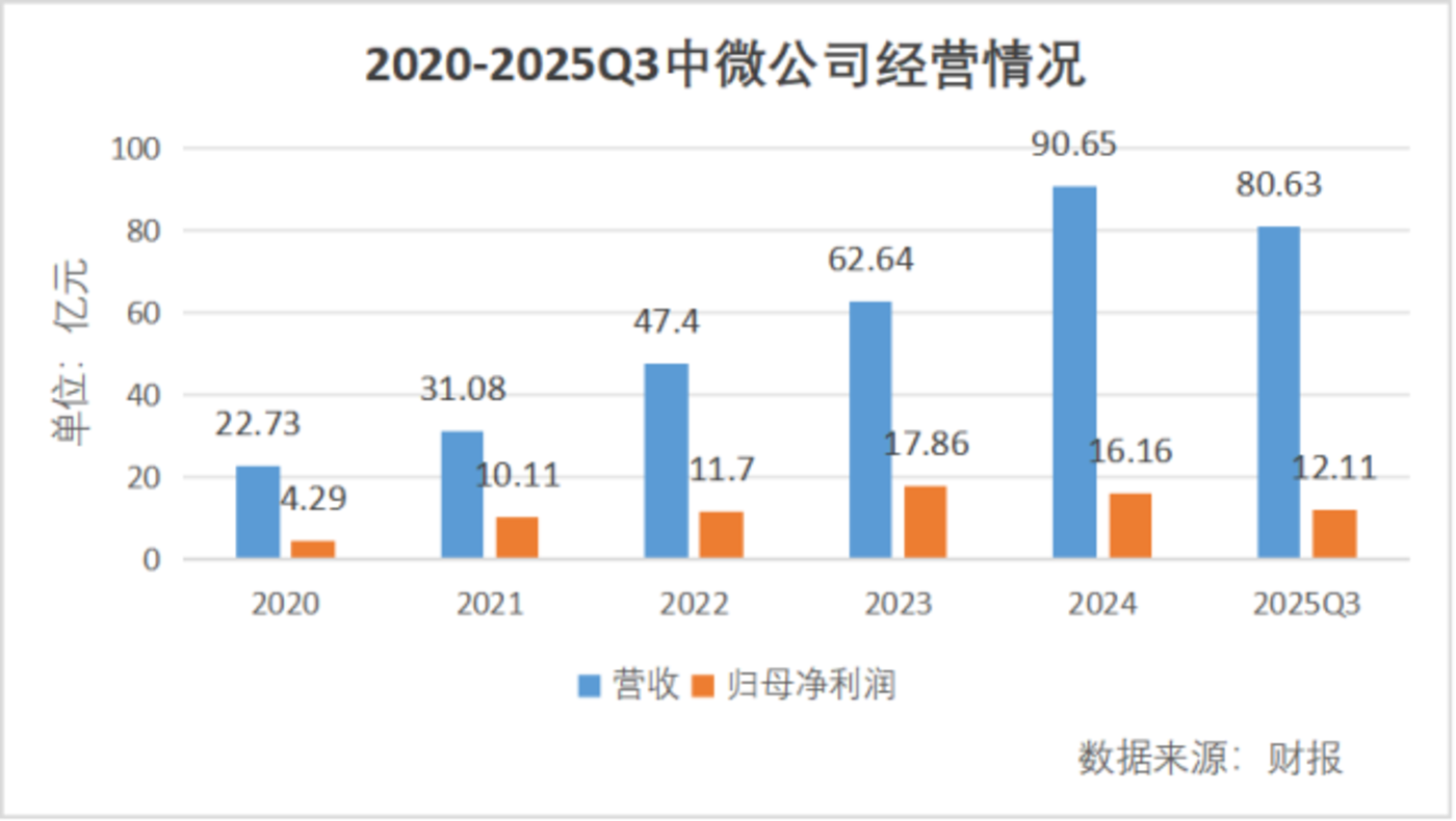 正因如此,两家公司的规模已经不在同一水平线上。综合近些年财报数据,中微公司的营收和归母净利润一直维持向上增长趋势,截至2025年三季度两组数据分别为80.63亿元与12.11亿元,前者已经超过2023年的全年营收。