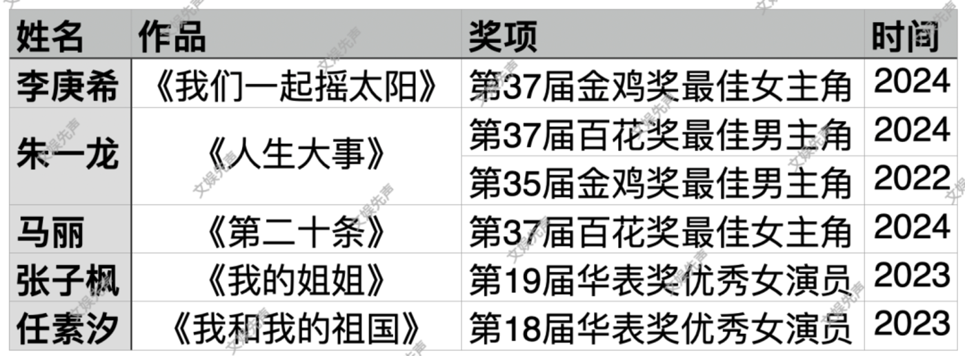 其中,朱一龙和马丽的经历即是典型。前者借金鸡奖、百花奖双料影帝成功打入电影圈核心,后者则凭借百花奖影后自证演技,获得了与张艺谋、姜文、郭帆等顶级导演的后续合作机会。