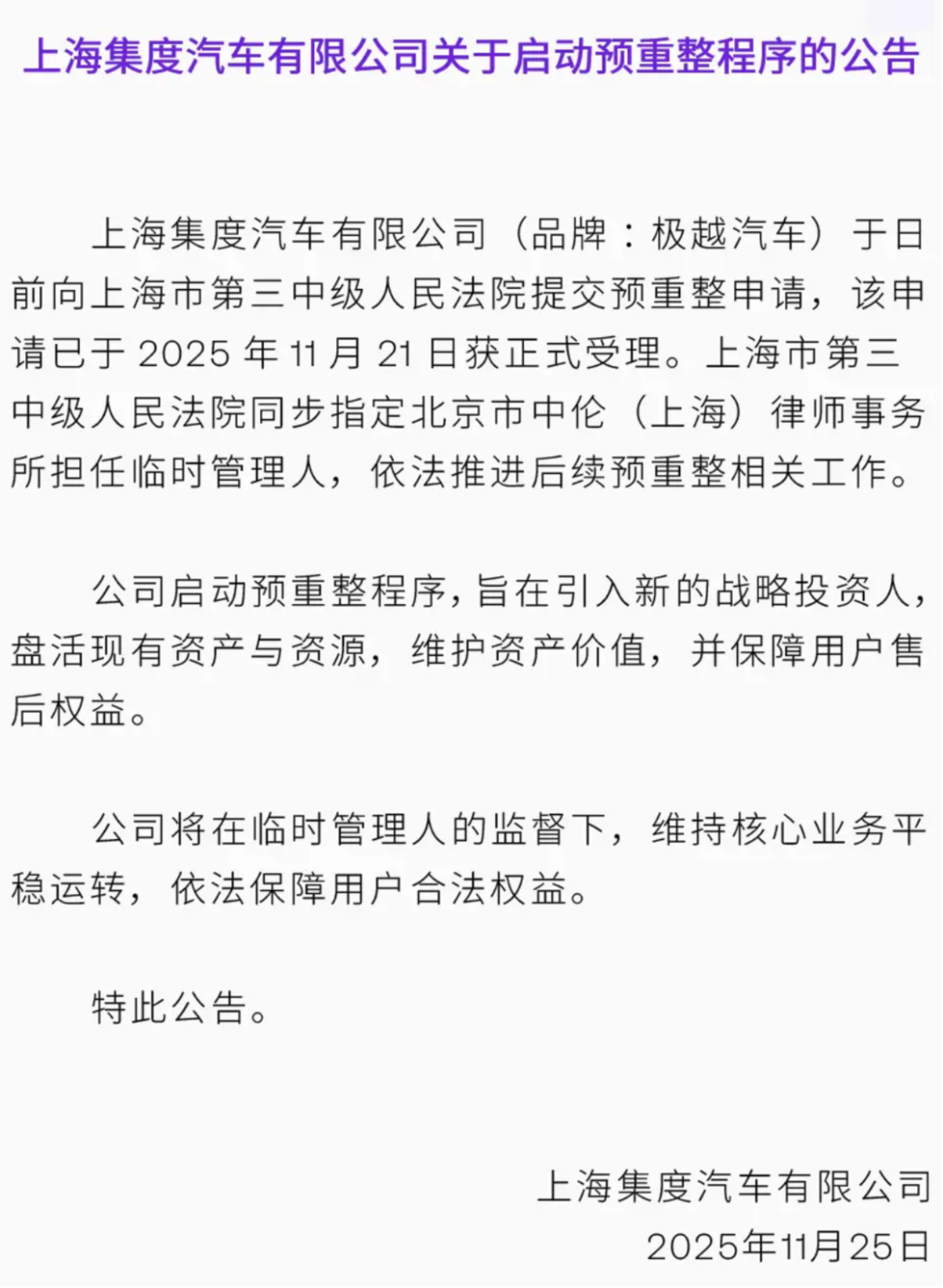 据极越汽车消息,上海集度汽车有限公司11月25日公告,公司于日前向上海市第三中级人民法院提交预重整申请,该申请已于2025年11月21日获正式受理。