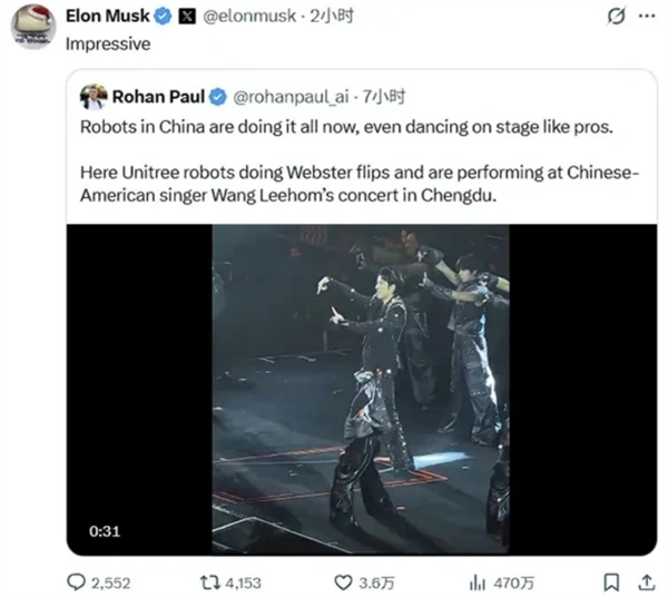值得一提的是,特斯拉CEO马斯克也在社交平台X转发了该视频,并评价称“Impressive(令人印象深刻)”,进一步推高关注度。