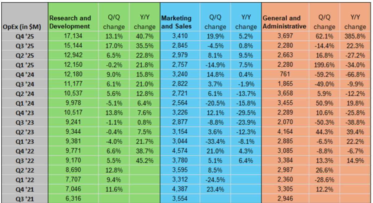 然而,持续攀升的支出规模依然是市场关注的焦点。Meta在财报中给出了极具扩张性的未来资本支出指引,预计2026年资本性开支将达到1150亿至1350亿美元,远超市场预期的1106亿美元左右。