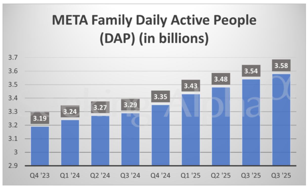 核心业务方面,Meta旗下应用家族(Family of Apps)在该季度展现出强劲的用户粘性。每日活跃人数(DAP)攀升至35.8亿,同比增长7%,而AI赋能的广告推荐算法使得广告展示量同比增长18%,单位价格也逆势上调了6%。