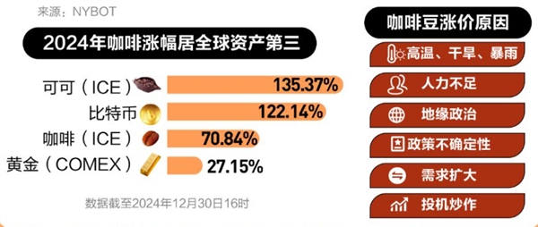 美国阿拉比卡咖啡豆的期货价格一年时间涨了 118%,去年 2 月突破了 430 美分/磅,达到了 47 年以来的最高价格。其他像云南咖啡豆之类的,基本也都涨了 60-100%。