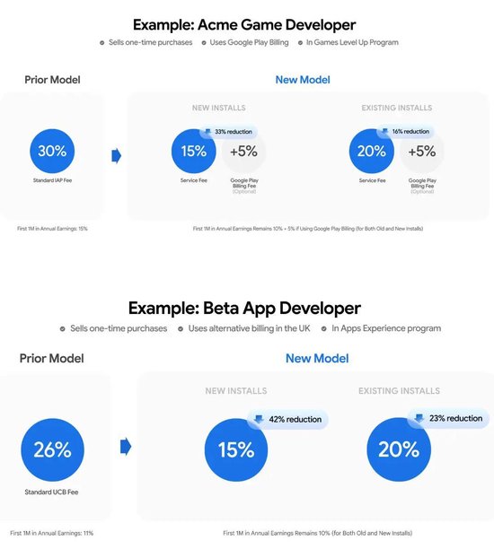 支付处理费方面,如果开发者选择继续使用谷歌官方的Google Play Billing支付系统,在美国、英国和欧洲经济区(EEA)市场,需要额外支付5%的费用;若开发者使用自己的支付系统或引导用户至外部网站完成支付,则无需缴纳这笔费用。这意味着,对于选择自建支付渠道的开发者,其综合成本最低可降至15%,相比过去的30%下降了一半。