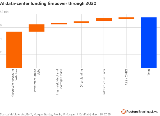 若将Alphabet、亚马逊、Meta、微软、甲骨文(143.66, 0.49, 0.34%)的预计经营性现金流,加上可动用的债务与投资资金测算,可用资金总额约7.5万亿美元,仅处于黄仁勋预估区间的中位水平。