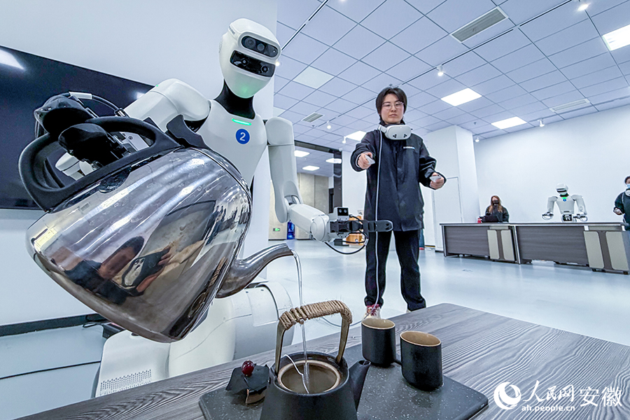 人民网马鞍山4月20日电 (记者李希蒙)近日,记者来到位于安徽省马鞍山市雨山经开区图灵小镇的马鞍山具身机器人技术创新中心,只见多台机器人正在训练师的操控下,反复训练插拔电器、整理衣物、茶壶倒水等生产生活类动作。 端得稳、倒得准。人民网记者 李希蒙摄