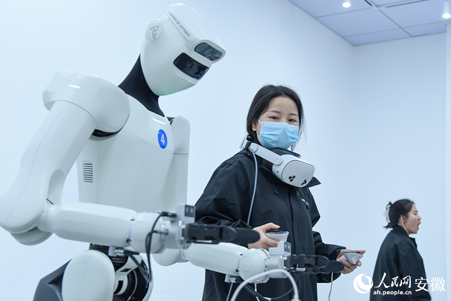 具身机器人正在训练师的操控下,反复训练动作。人民网记者 李希蒙摄